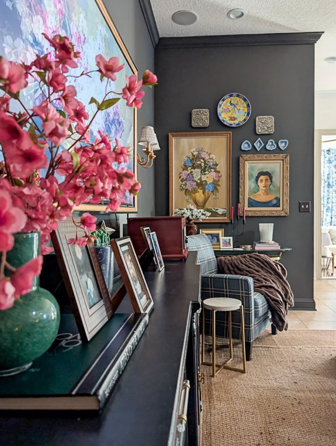 Living room with dark gray walls, decorated with framed artwork, a vintage blue-gray sideboard, a plaid armchair, a glass-top coffee table with books and decorative items, and floral arrangements. There are wall sconces, a mirror, and a round decorative plate on the wall.