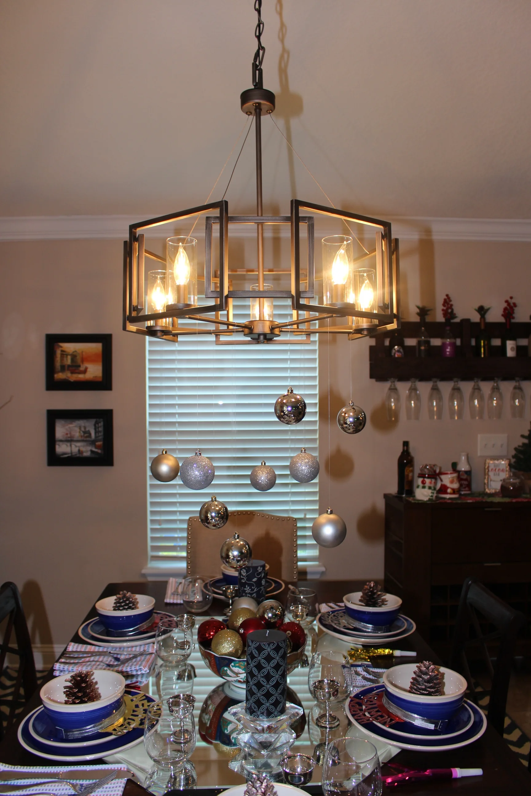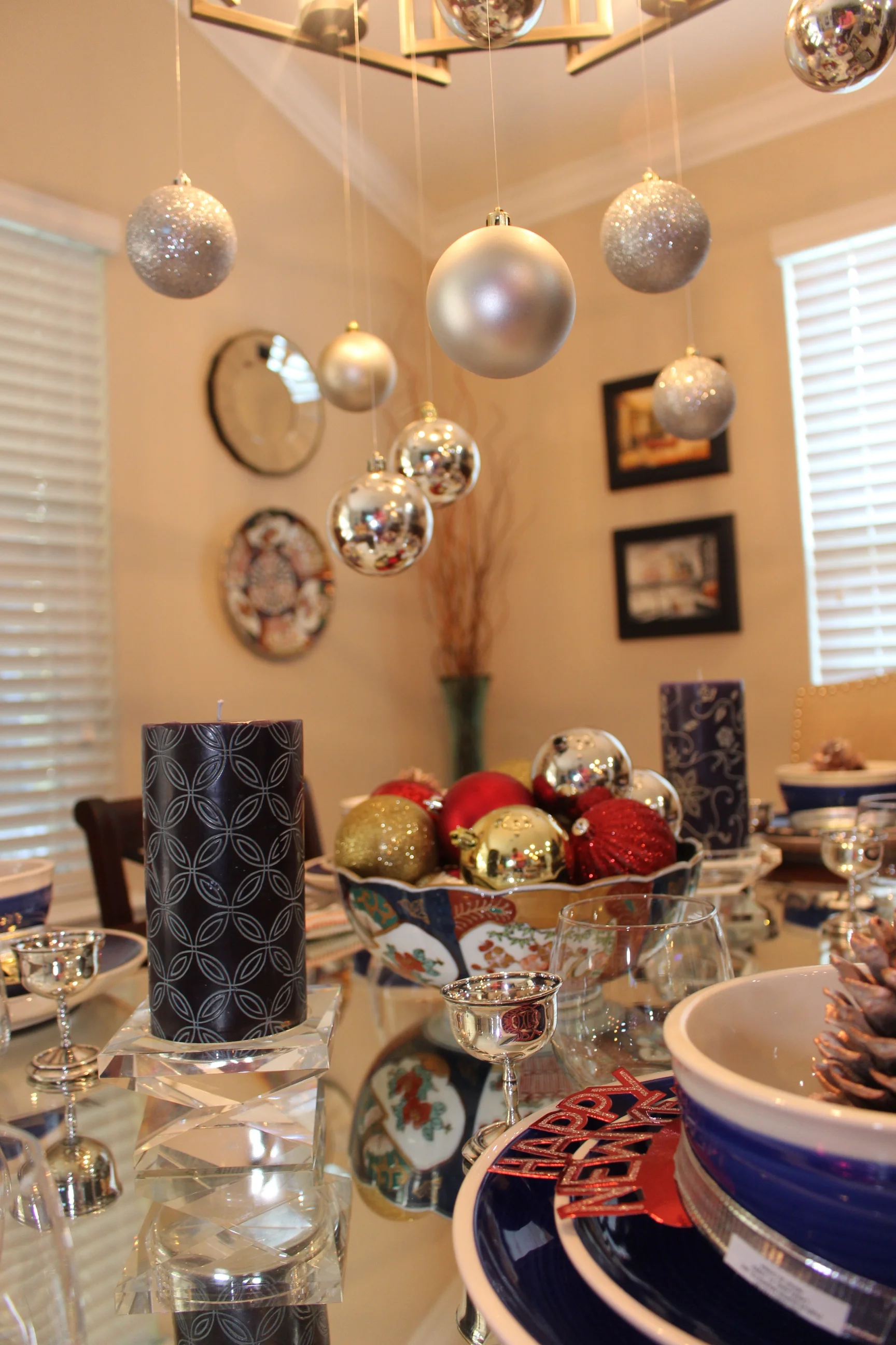 I love how it reflects light up, especially when the chandelier is on. I then added several silver ornaments and hung them from the chandelier with fishing line at different lengths. Glitter, matte, shiny silver ornaments to give the eye some visual interest. Right below, I placed my Gold Imari bowl that I have filled with leftover ornaments in the red, gold, and silver colors flanked by two crystal candle holders with two blue pillar candles.