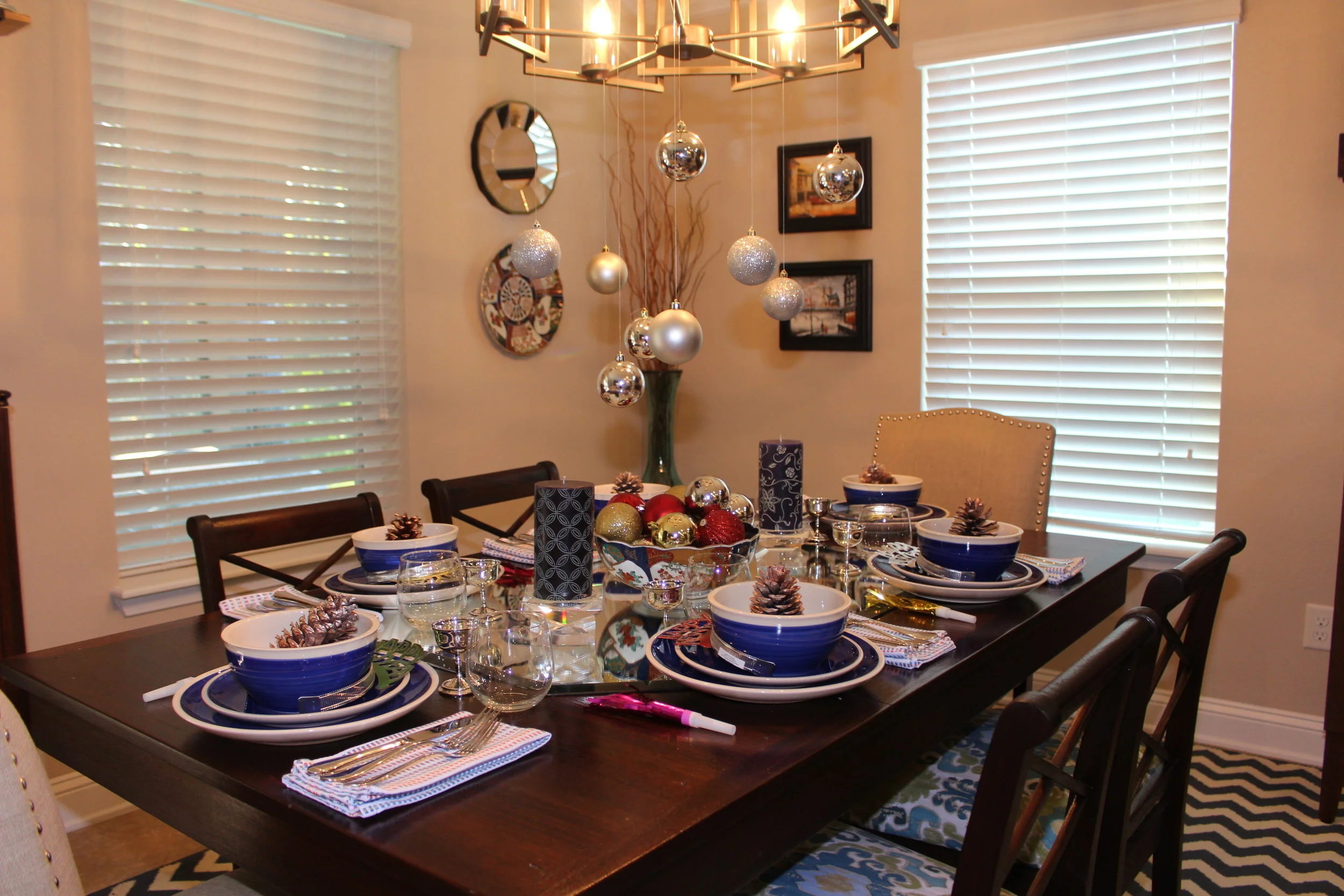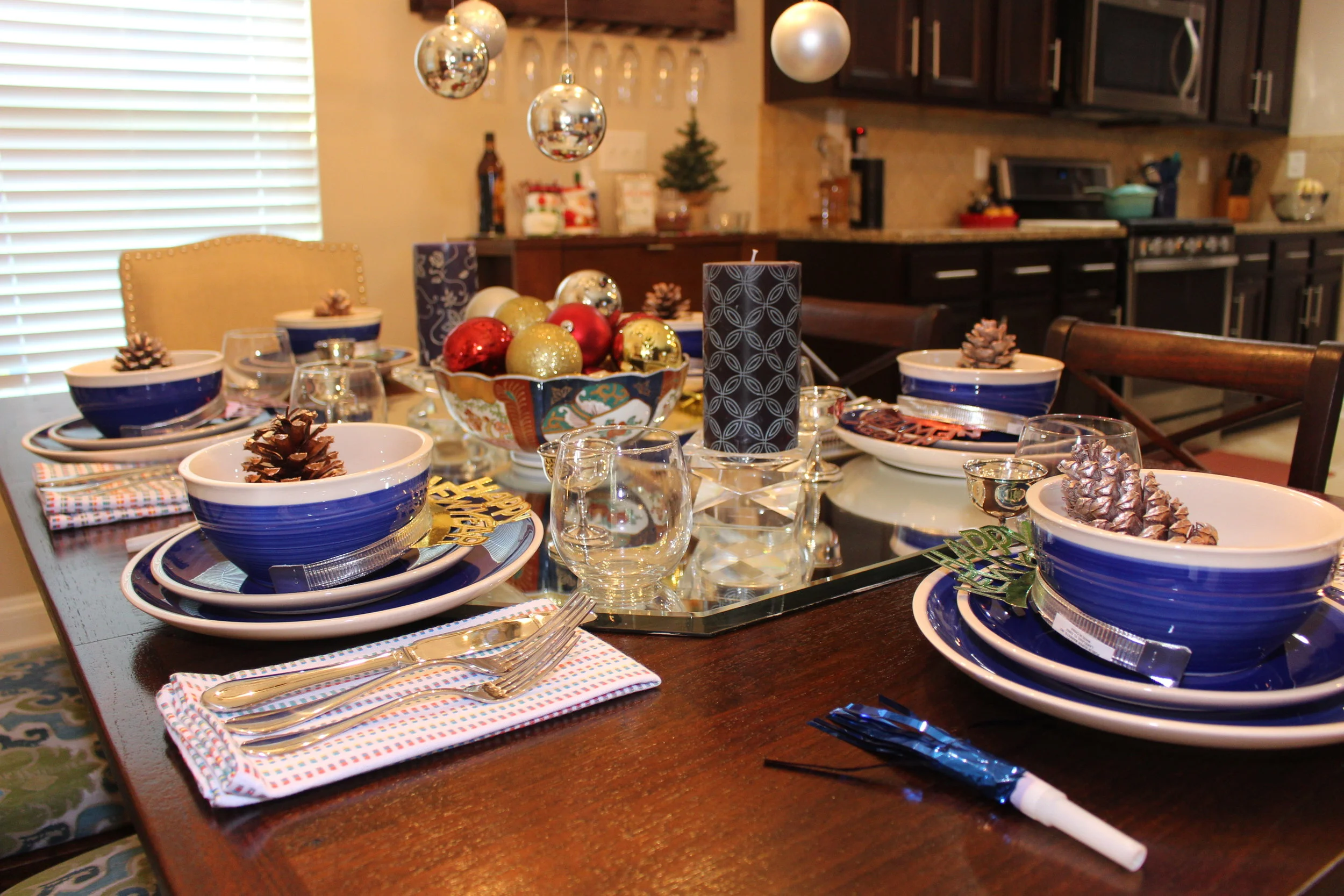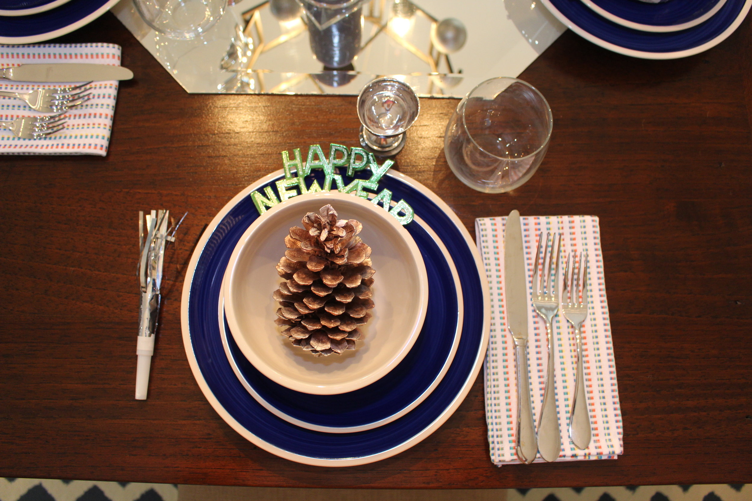 I then decided to use our blue china set that we typically use daily. I absolutely love this set of plates from Better Homes and Gardens that I got from Walmart. They are amazingly beautiful and durable. To add a New Years touch, I placed a Happy New Year headband around each bowl and inside, I placed the copper and silver pine cones that I DIY'd.