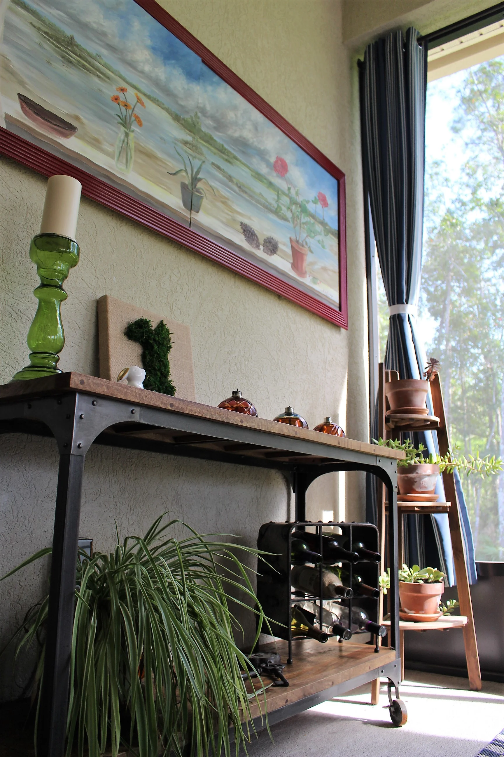 I decorated with a lot of greenery in this space. It helps bring in some nature into the space and I just love the pop of color the plants provide against the beige walls. This is also the best place to keep our house plants since this room gets tons of sunlight throughout the day.
