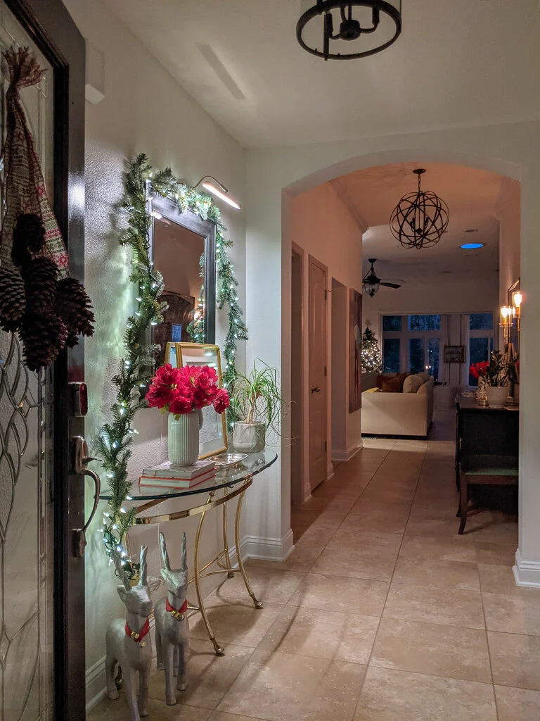 Starting with our front door, I hung my favorite wreath that I DIY'd by spray painting some pine cones silver and copper and hot gluing a pretty ribbon to them. I hung an IKEA garland over the entry mirror and strung lights to make a little move festive. Added some silver reindeer that I also DIY'd a couple of years ago by spray painting them silver and adding bells for their collar.