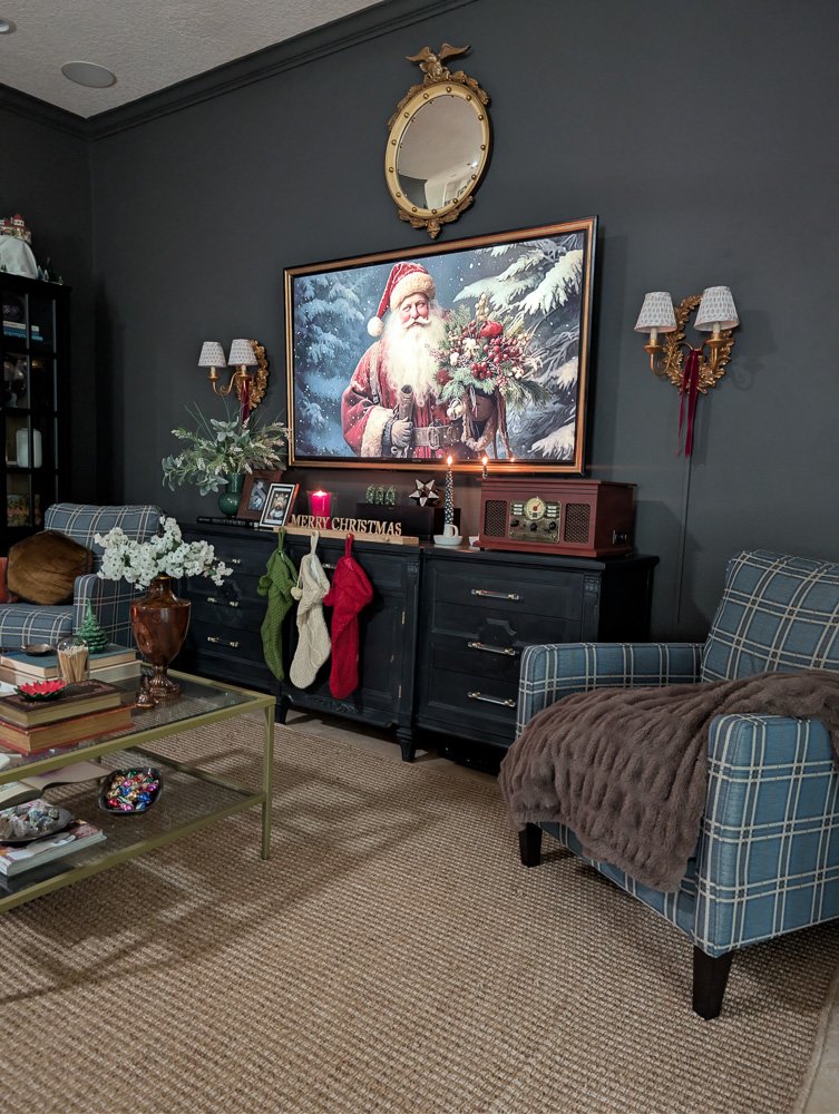 The TV Art: One of my favorite budget-friendly hacks is changing the TV art by simply searching on YouTube for “Christmas screensavers.” This vintage Santa painting on the screen sets the entire tone for the room. It feels like an oil painting without the price tag!