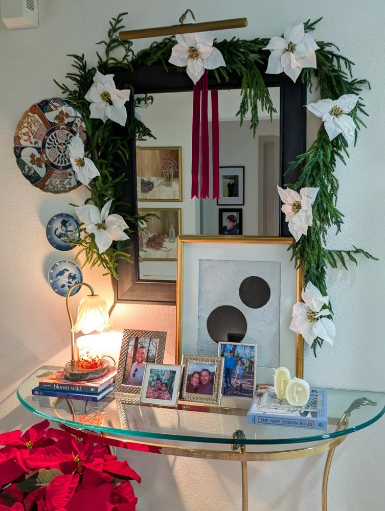 I dressed up our glass console with a garland draped over the mirror. DIY Tip: I used a basic faux cedar garland and tucked in large white faux poinsettias that I got at Dollar Tree to give it volume and brightness. It connects the black mirror frame to the rest of the decor beautifully.