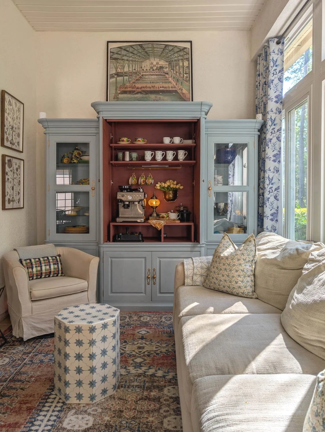 Completely transformed! The contrast between the light blue exterior and the deep red interior is the heart of this Moody Traditional look.
