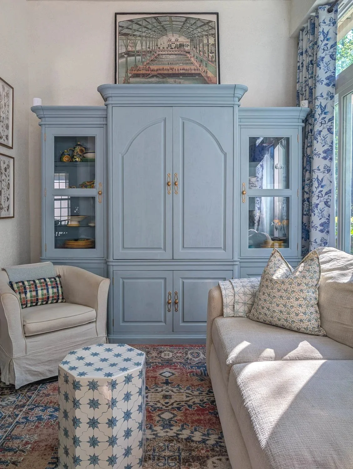 I settled on a high-contrast pairing: a soft, dusty light blue (‘Gingham’ by Behr Chalk Paints) for the exterior to keep the piece from feeling too heavy in the room, and a deep, dramatic, muted red (‘Fading Twilight’ by Benjamin Moore) for the interior. This pop of color inside creates a jewel-box effect when the doors are opened.