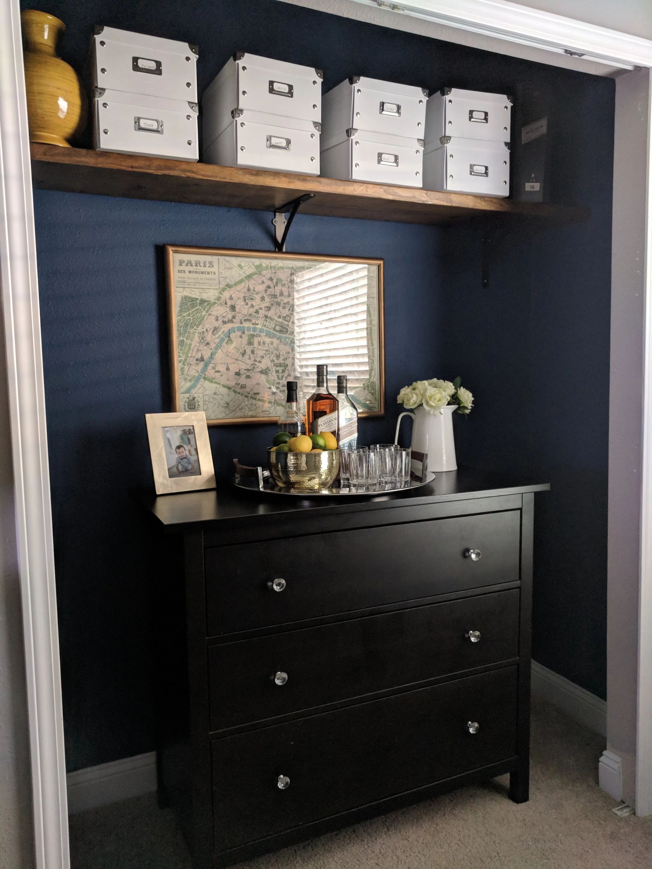 For above the dresser, I had a vision of creating an old school vintage bar set up. I brought in my favorite round silver tray that I found several years ago at Home Goods to help reflect light up in the dark closet. I dressed up the tray by using some of my husband's favorite whiskey's along with some glasses and a gold metal bowl I got from Tuesday Morning. Dressed it all up with some flowers, a fun family picture, lemons and limes and finished it off by hanging up one of our favorite map prints.