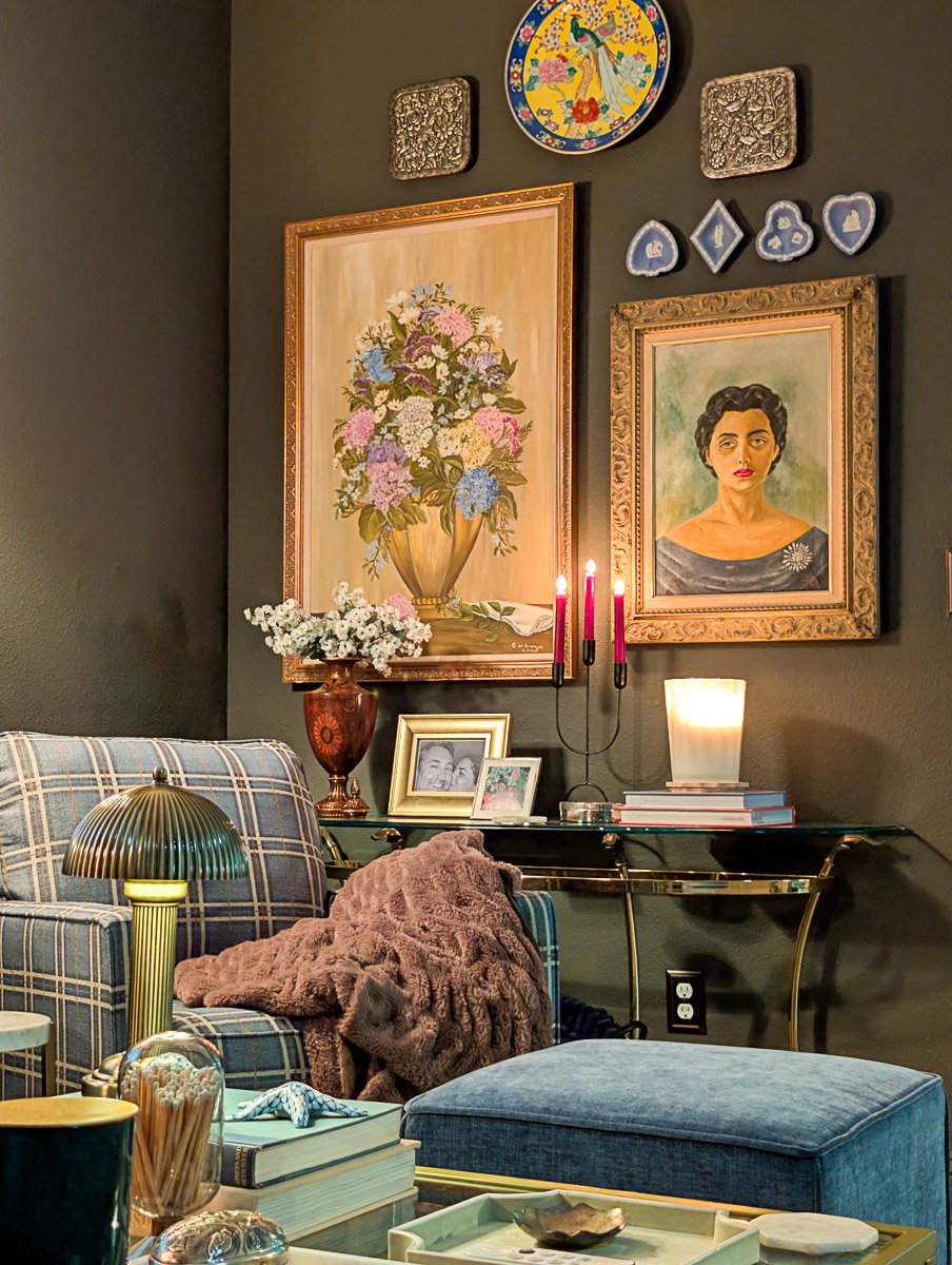The Console or Entryway: Use a large back anchor, like a moody landscape painting or a gold-rimmed mirror, to frame your stacks and give the vignette depth.