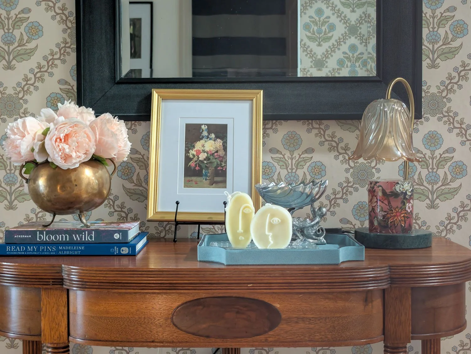 If you follow my blog, you know I’m a sucker for brass. To complement the deep tones of our new wallpaper, I used a brass vessel for our florals, which adds a necessary gleam against the dark walls.