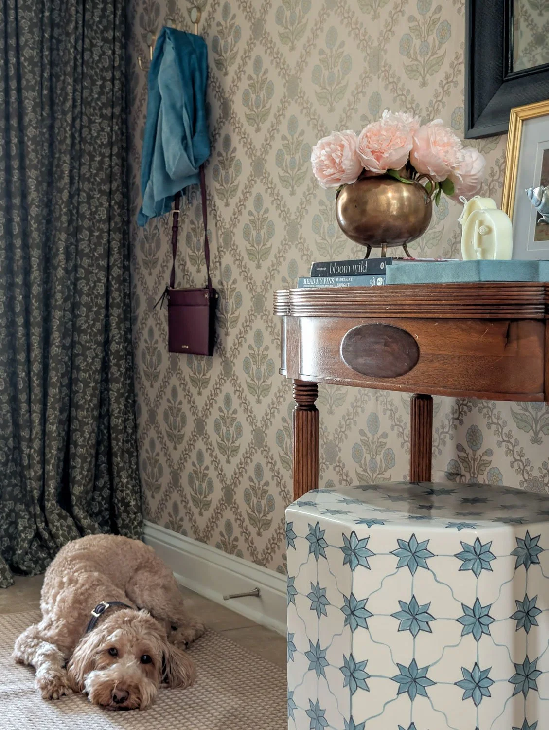 The wood table has the heaviness and history needed to anchor the floral wallpaper, making the entryway feel like a permanent, established part of the home. The best part? The glass and brass table actually looks much better in the living room now! Against the dark walls there, the brass pops and the glass keeps the room feeling airy rather than cluttered. It was a win-win swap that cost $0.