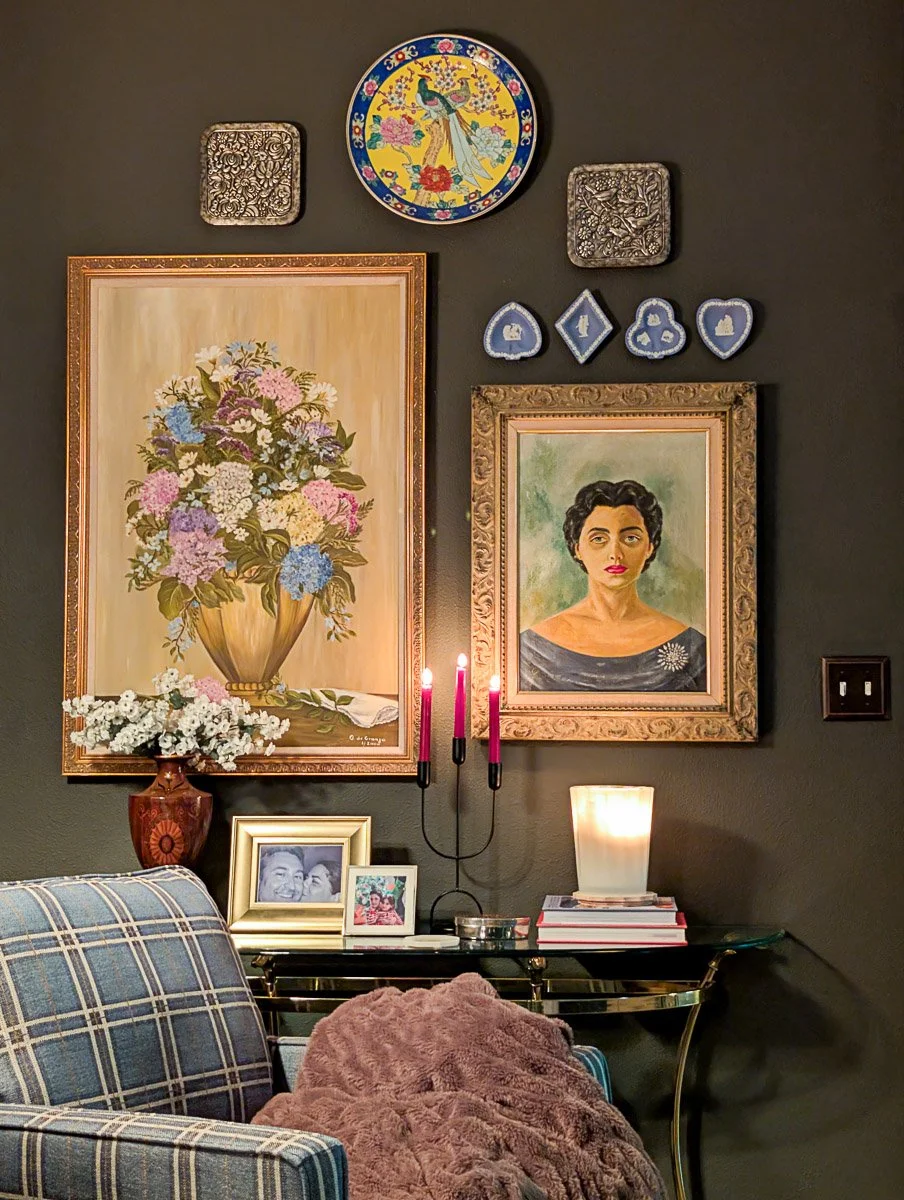 Pro-Tip: For an authentic, collected over time feel, don't feel obligated to hang every piece of art. Leaning smaller vintage paintings against the wall on a console table creates a relaxed, grandmillennial vibe that feels curated rather than staged. To add a bit of height and architectural interest, try using a delicate brass or iron tabletop easel. It’s a simple way to make a small heirloom painting feel like a focal point.