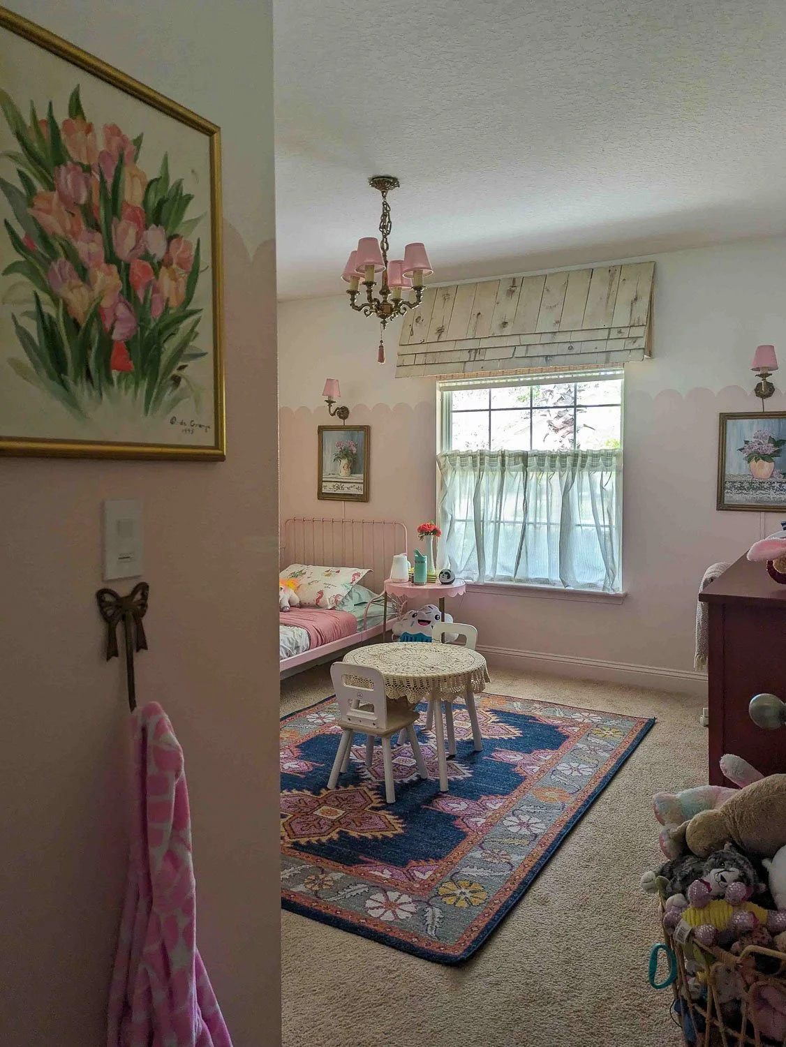Area Rug | Small Table and Chairs | Pink Sconce Shades | Princess Comforter