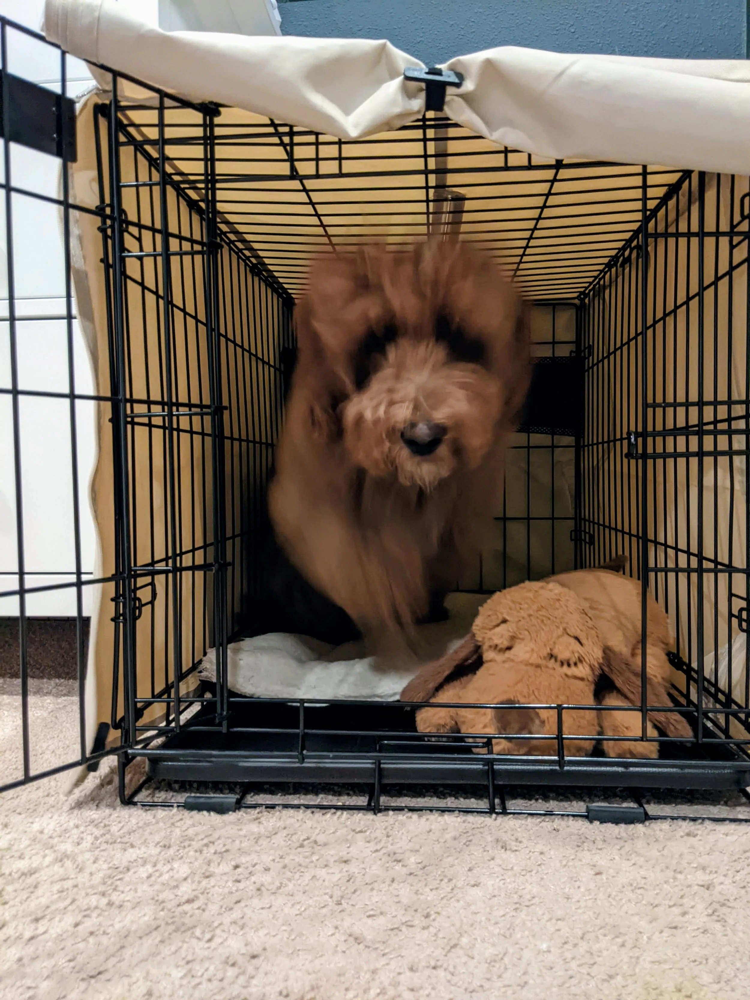 Charlies “room” is a kennel that’s big enough for him to stand up and turn around in. It took some time, but he’s finally gotten the hang of the kennel and now stands right in front of it waiting for us to open the door so that he can go in to rest. It makes me so happy that he feels like he has his own space in our home.