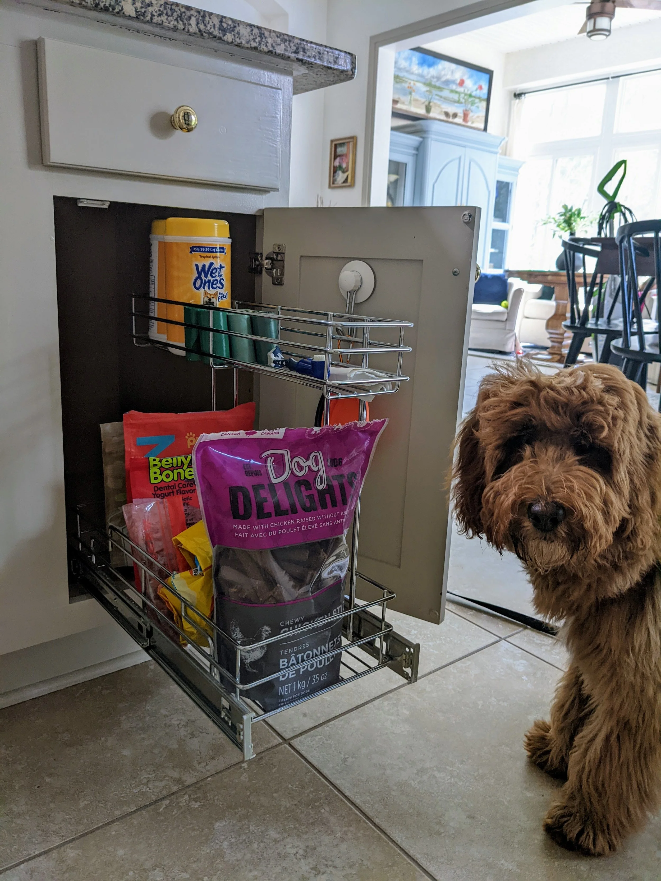 In this cabinet we keep all of Charlie’s food and treats. This stuff takes up a lot of space! We’ve been working hard on training Charlie, so we have several different kinds of training treats plus some chew toys and poop bags.